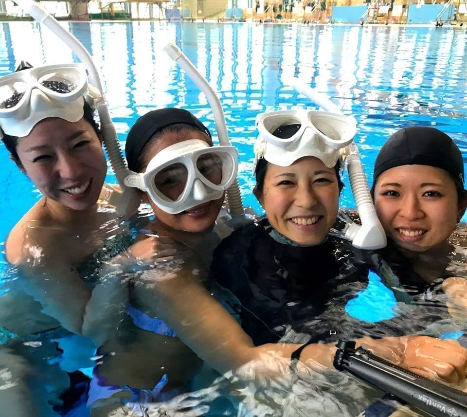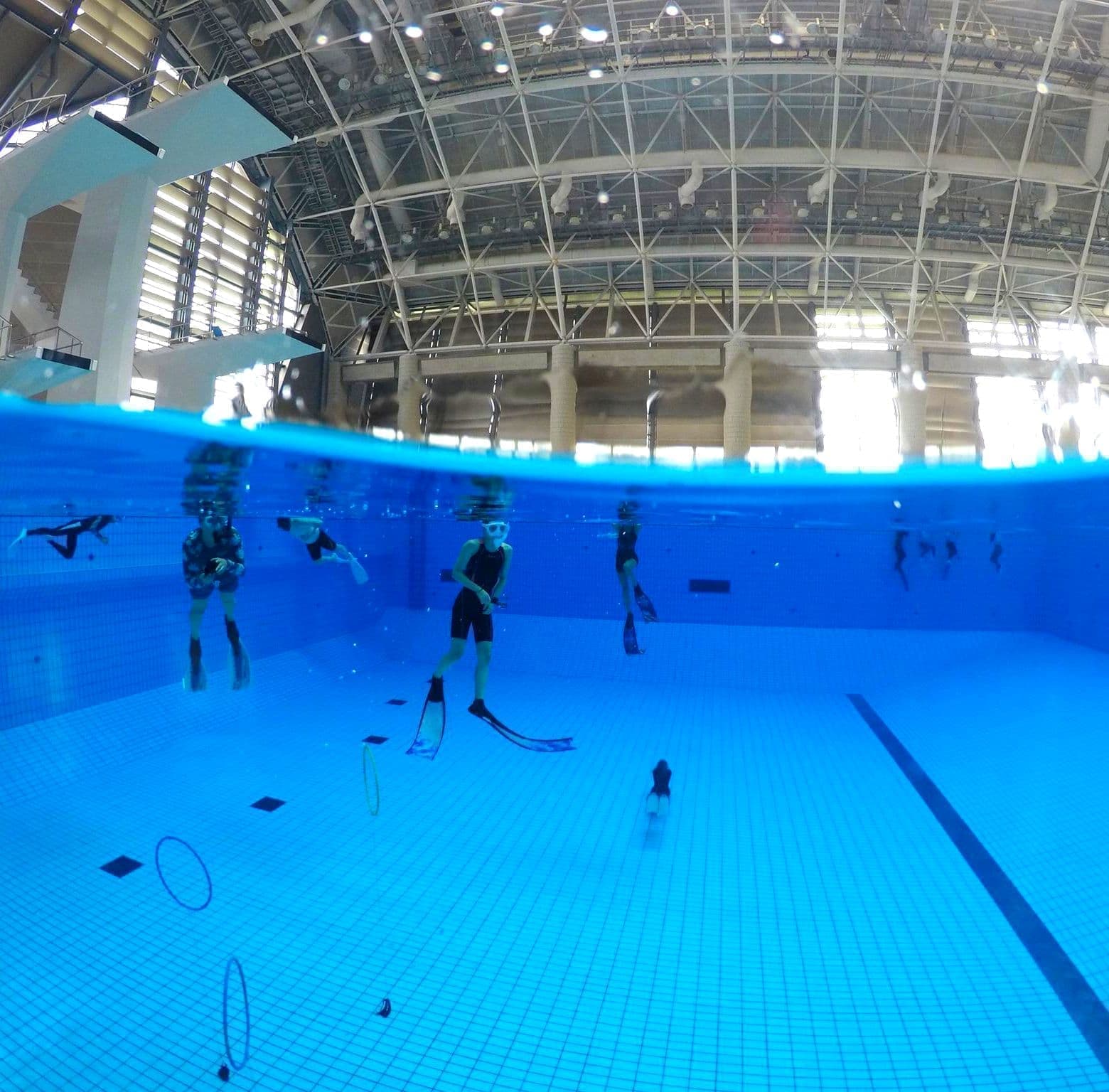 ダイビングプールで素潜り遊び!フラフープを使った水中アスレチックやフリーダイビング海洋種目体験などのイベントもやっています。基本的にはバディ単位でフリーなので、耳抜きやフィンワークなどの練習、インスタ映えする写真の撮影もして頂けます。