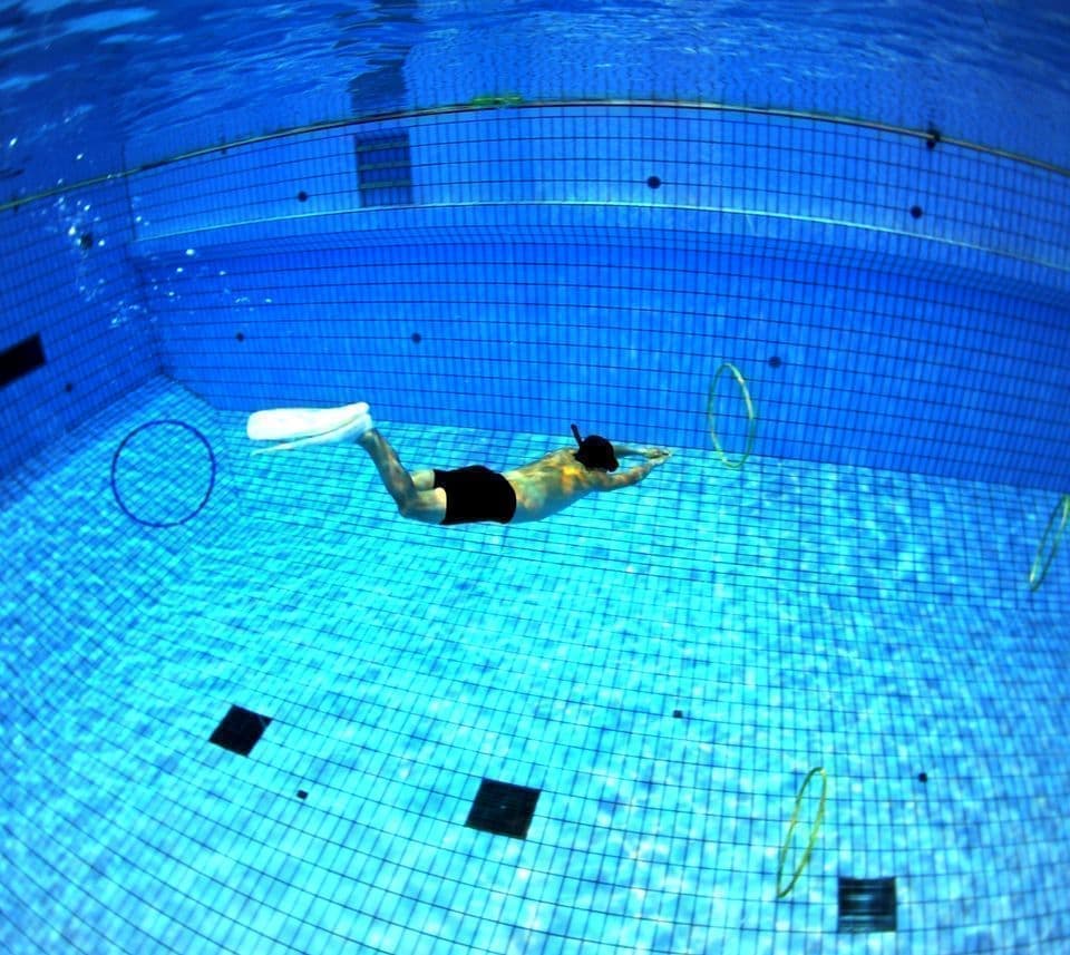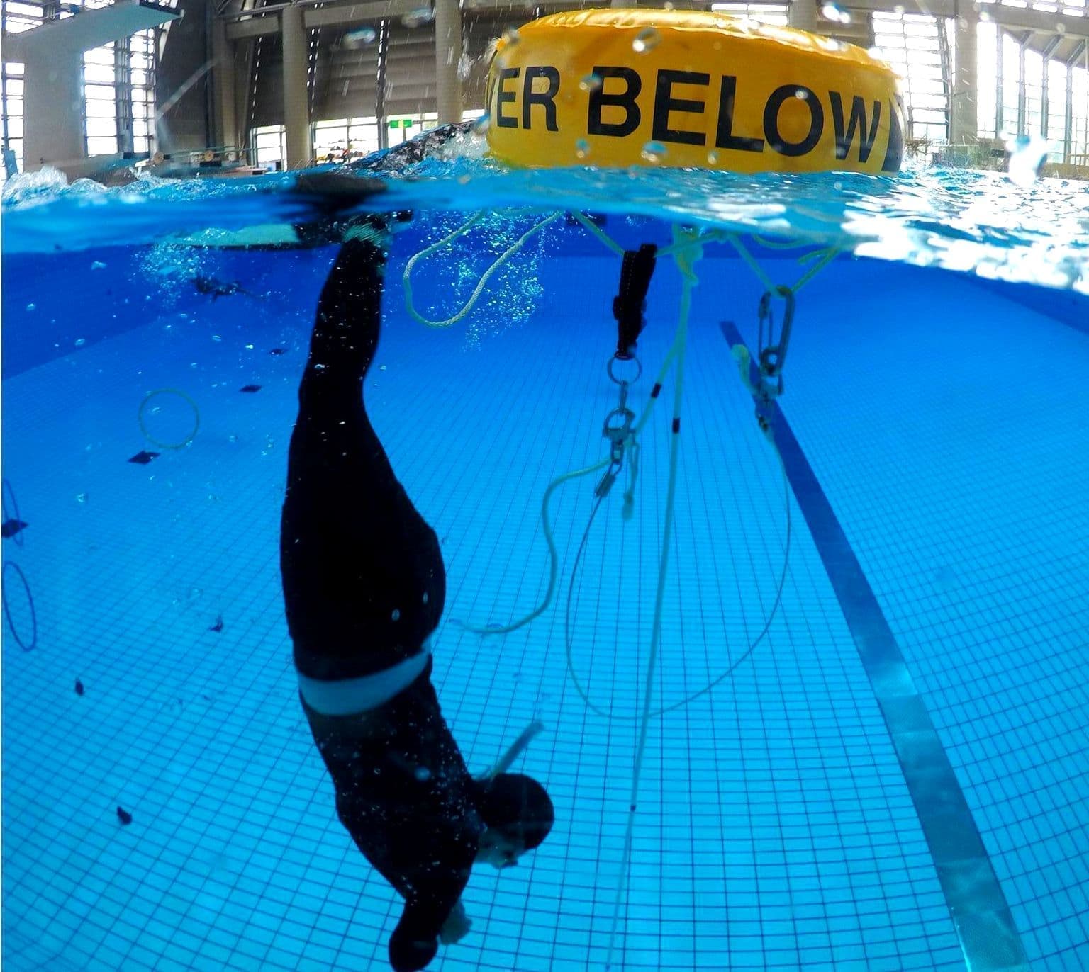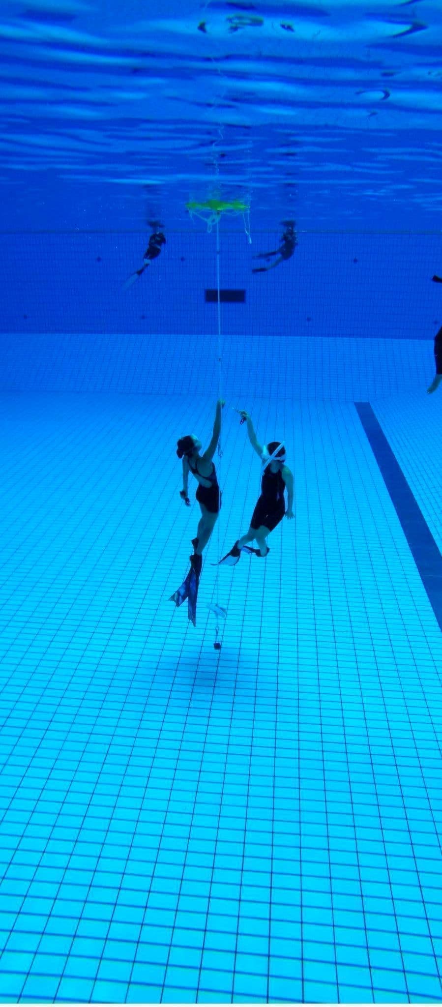 フリーダイビング海洋種目をプールで体験することができます。フリーダイバーコースの予行練習、テレビで見て興味がある、ただやってみたい。理由はなんでもOKです。ボトムプレートにはタグが設置してありますので、目標の水深まで潜水してタグ取り体験してみてください。